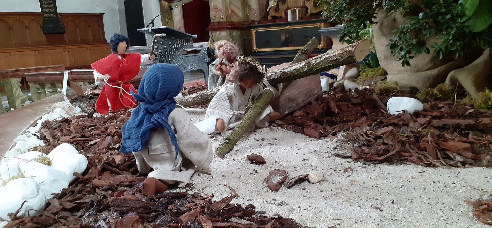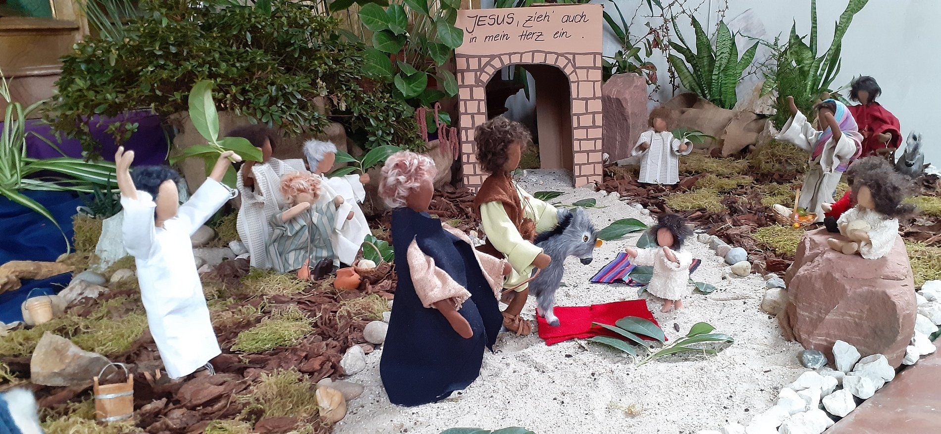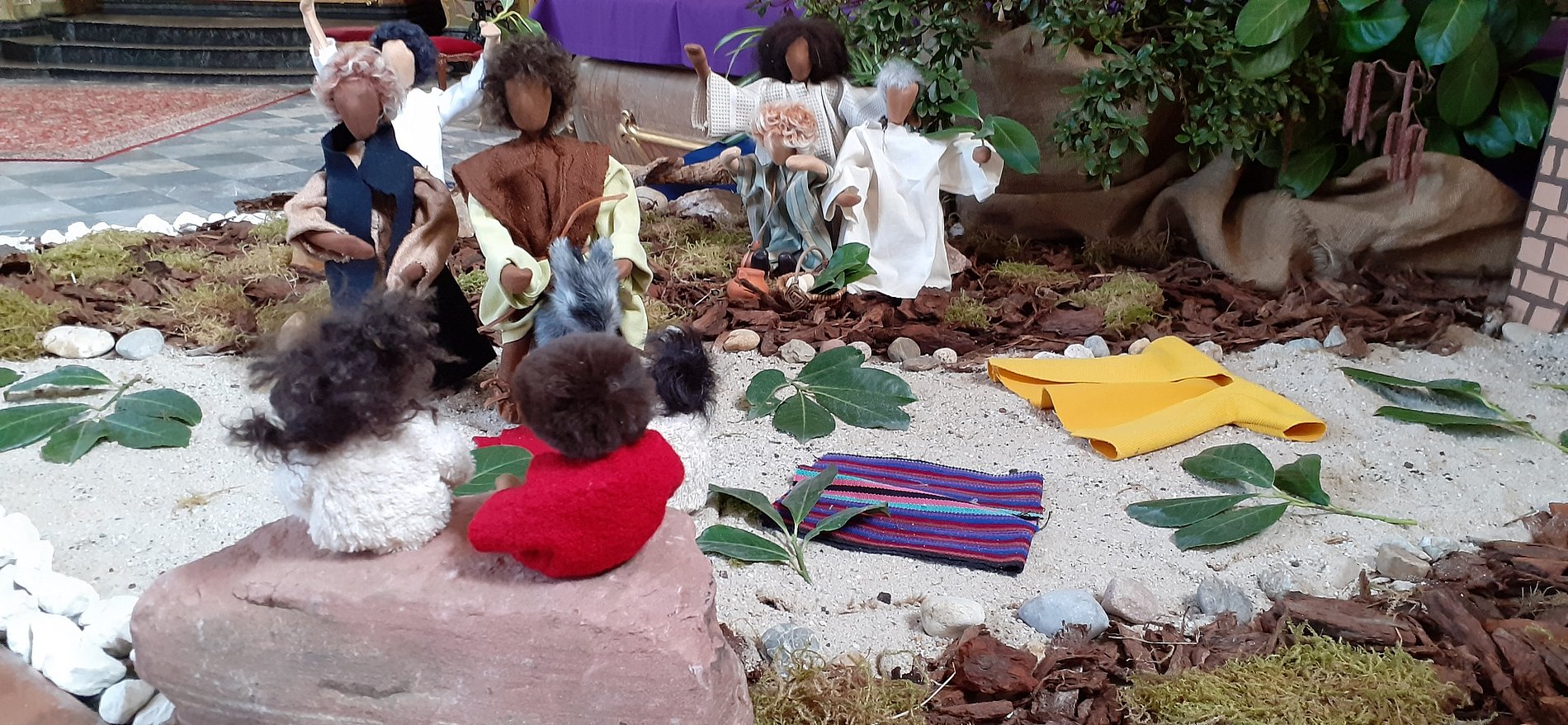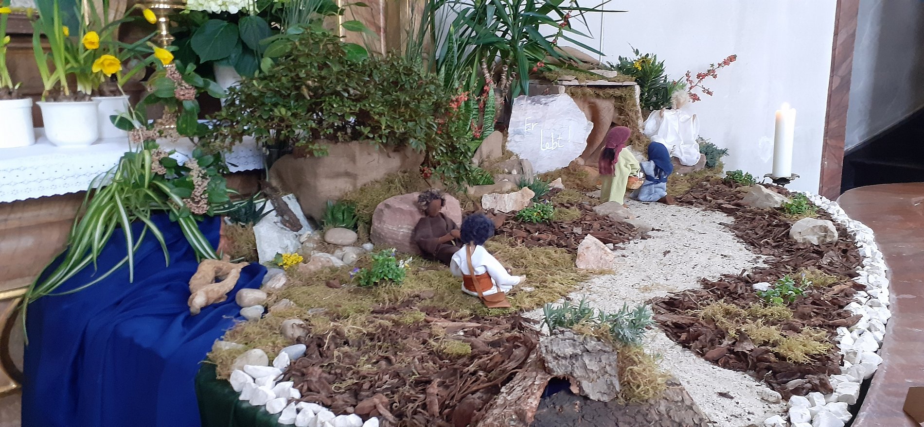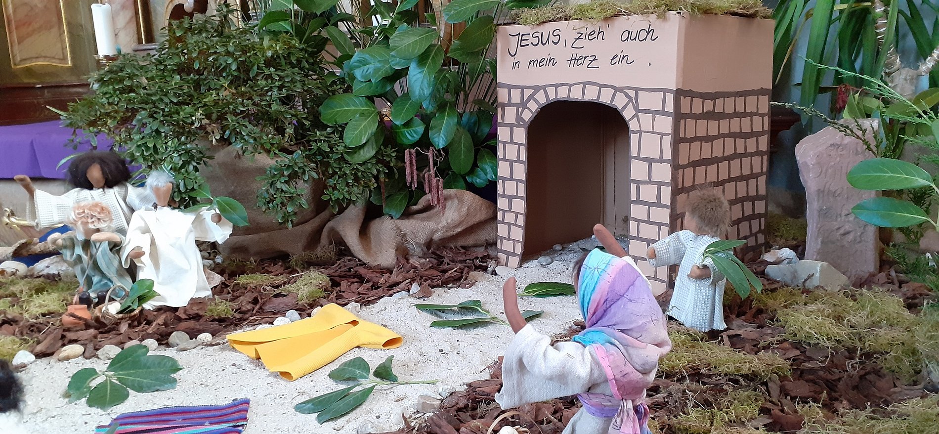 Am Samstag vor Palmsonntag haben sie mit männlicher Unterstützung einen Teil der Fläche für die jährliche Weihnachtskrippe aufgestellt und anschließend gestaltet. Es ist der Einzug Jesu nach Jerusalem dargestellt.