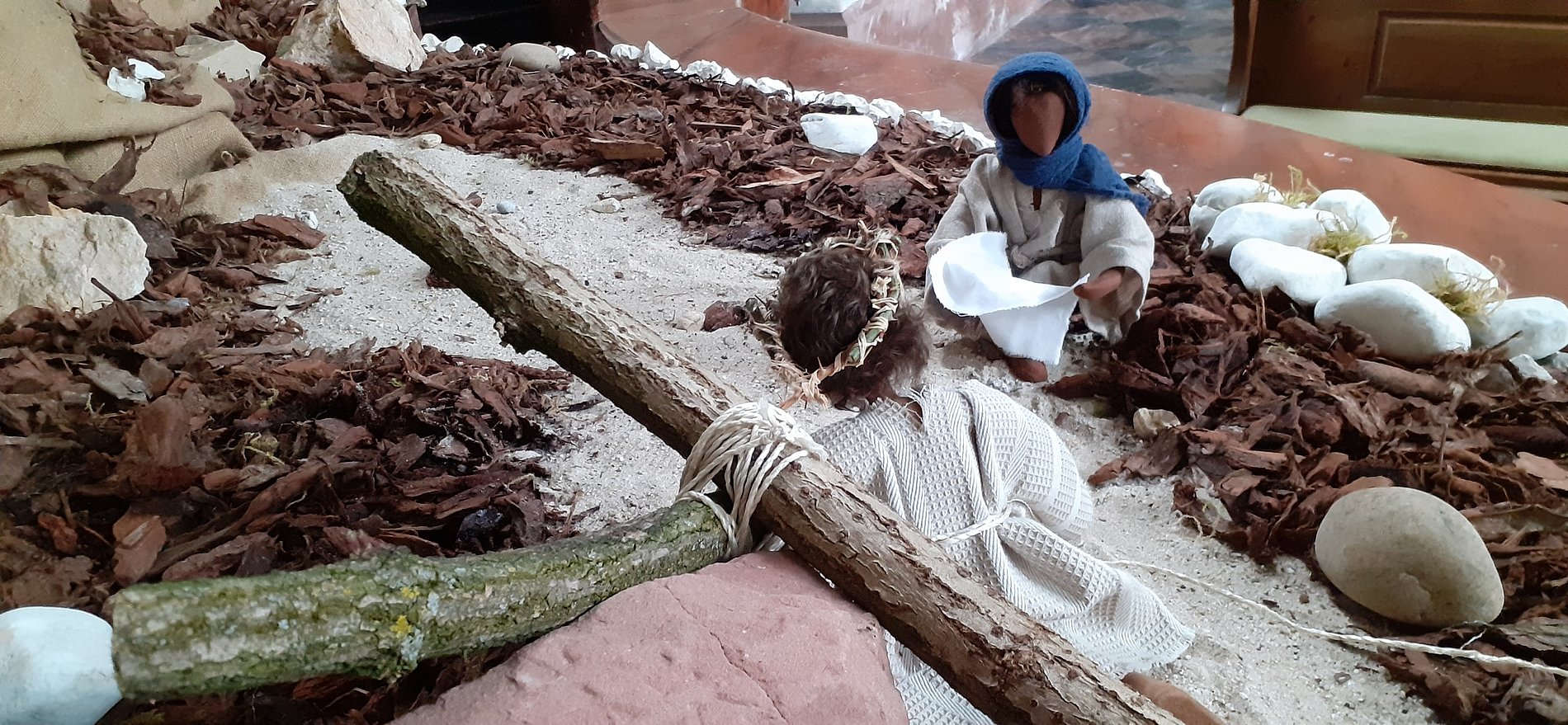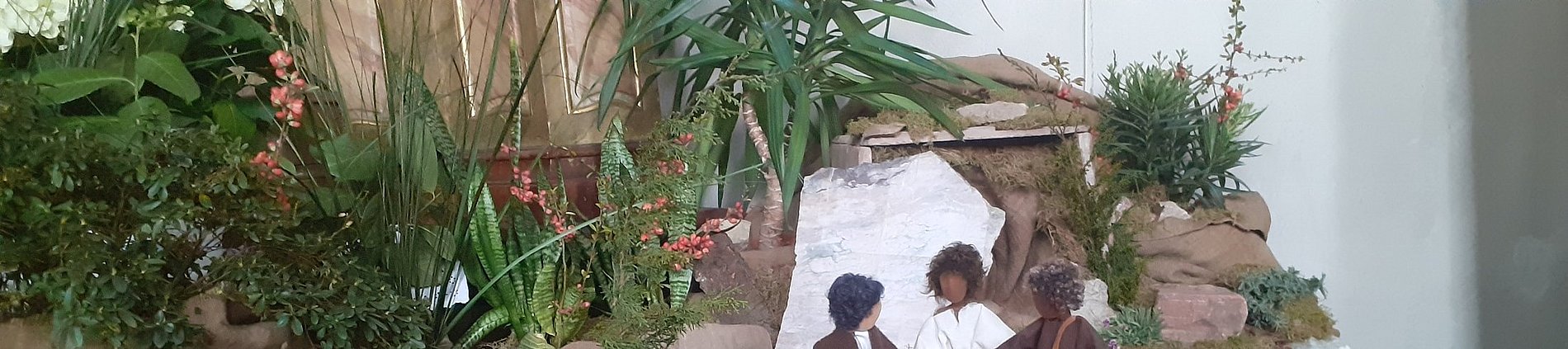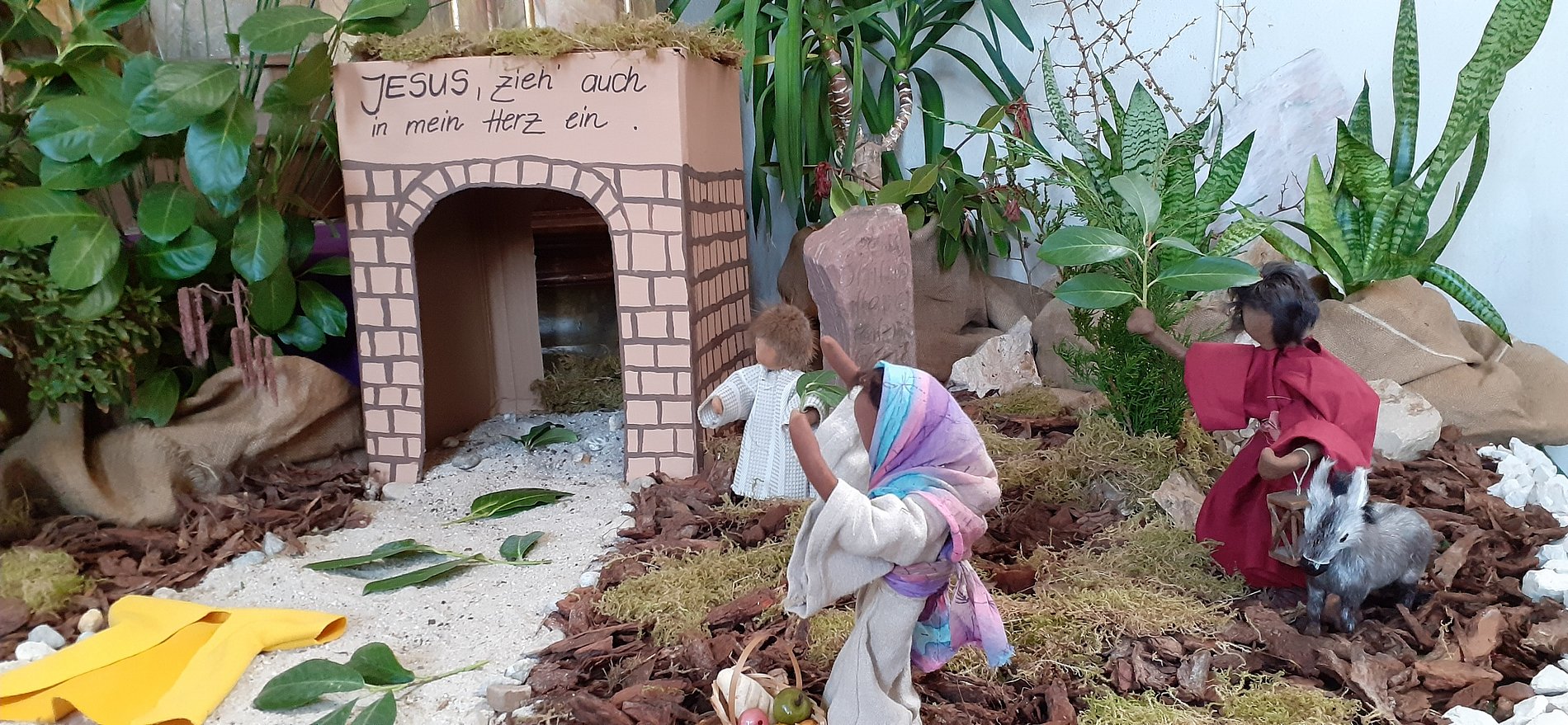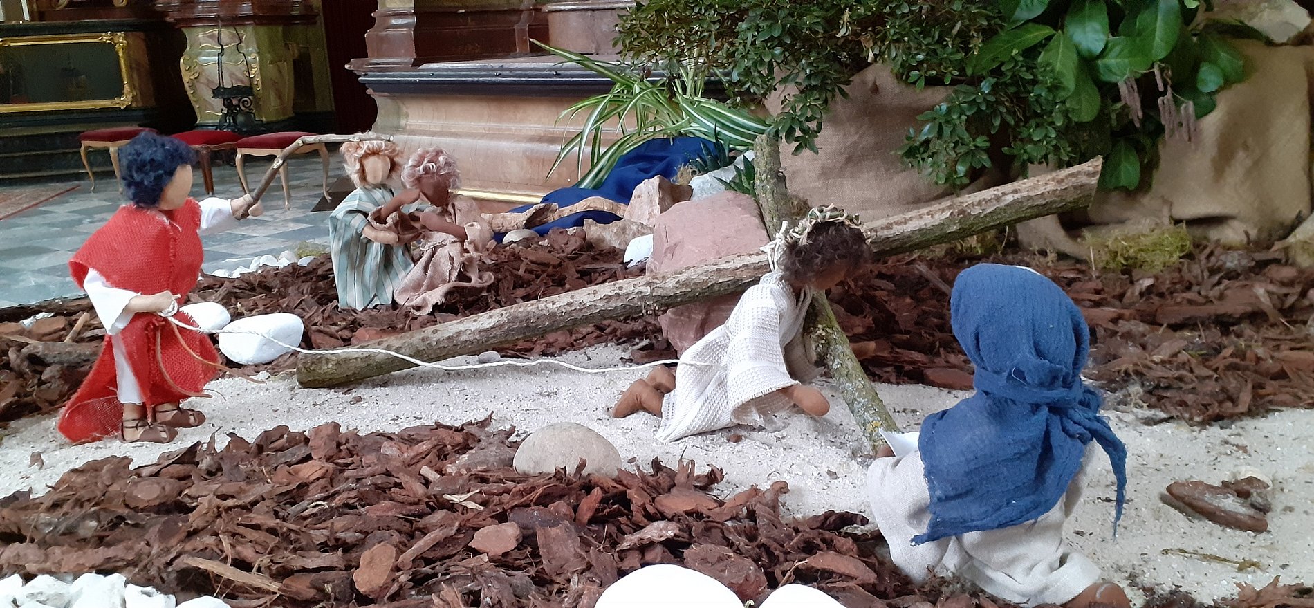 Am Samstag vor Palmsonntag haben sie mit männlicher Unterstützung einen Teil der Fläche für die jährliche Weihnachtskrippe aufgestellt und anschließend gestaltet. Es ist der Einzug Jesu nach Jerusalem dargestellt.