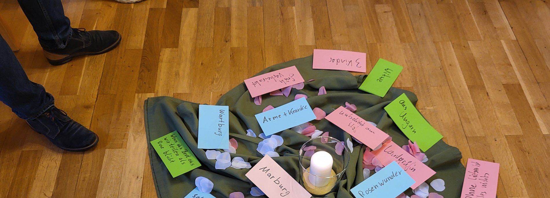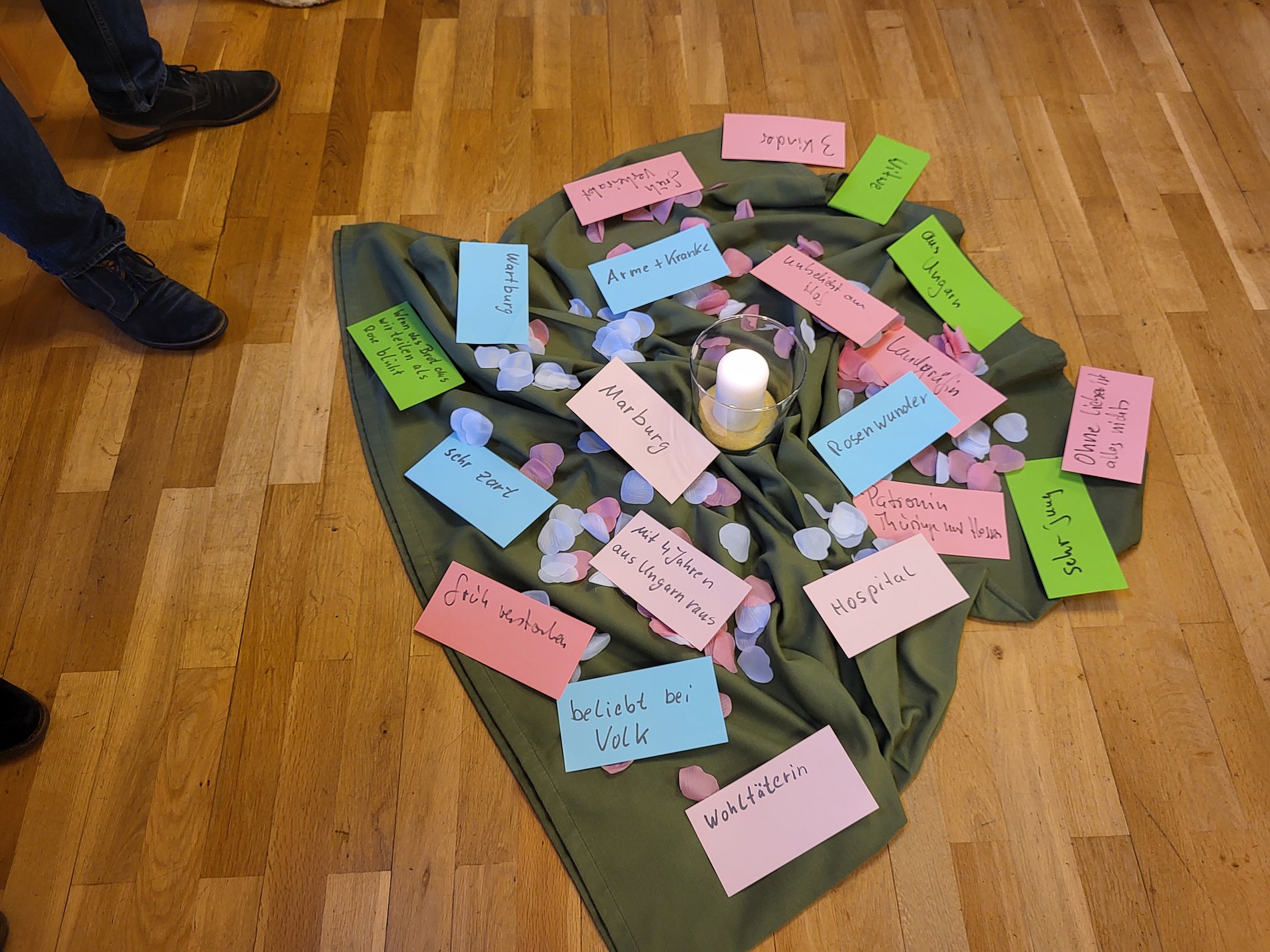 Um Elisabeth und ihre Handlungsweisen besser verstehen zu können nimmt Christian Preis, Bezirkspräses, die Teilnehmenden mit auf eine spannende Reise ins Mittelalter. Eine Zeit in der es Strömungen in der Kirche gibt die sich gegen den Reichtum innerhalb der Kirche auflehen und Armut und einfaches Leben fordern und auch leben. Hier zu gehört auch Conrad von Marburg. Außerdem gibt es Frauen, die Beginen, die ohne Männer und nicht in einem Orden leben wollen und für Arme und Bedürftige da sein wollen. In dieser Zeit kommt Elisabeth mit 4 Jahren als Prinzessin aus Ungarn auf die Wartburg um mit 5 Jahren mit dem Landgraf Ludwig verlobt und mit 14 Jahren verheiratet zu werden. Obwohl es eine politische Hochzeit ist, ist es auch eine Liebeshochzeit. Elisabeth ist von Kind an eine sehr neugierige, wissbegierige und aktive Persönlichkeit mit extrem ausgeprägtem Gerechtigkeitsgefühl ohne jegliche Standesdünkel. Hilfsbereitschaft und Teilen sind ihr seid Kindestagen ein großes Anliegen. Dies führt in Adels- und Kirchenkreisen nicht gerade zu ihrer Beliebtheit. Bei den Armen und einfachen Leuten in Eisenach ist sie jedoch sehr beliebt denn sie unterstützt sie mit Nahrungsmitteln und medizinischer Hilfe. In ihrem Glauben findet sie stets Trost und Hoffnung. Conrad von Marburg wurde ihr Mentor und Unterstützer in Glaubensdingen. Stefanie Kohl lädt Nachmittags die Teilnehmenden ein sich in Elisabeth zu versetzen und ihrem Leben nach zu spüren. Zum Abschluss basteln die Teilnehmenden gemeinsam Rosen um sie an Person ihrer Wahl weiterzugeben. Zum Abschluss wird ein gemeinsamer Gottesdienst in der Wickerer Kirche gefeiert. Für alle Teilnehmende geht ein sehr eindrucksvoller und schöner Tag zu Ende.
