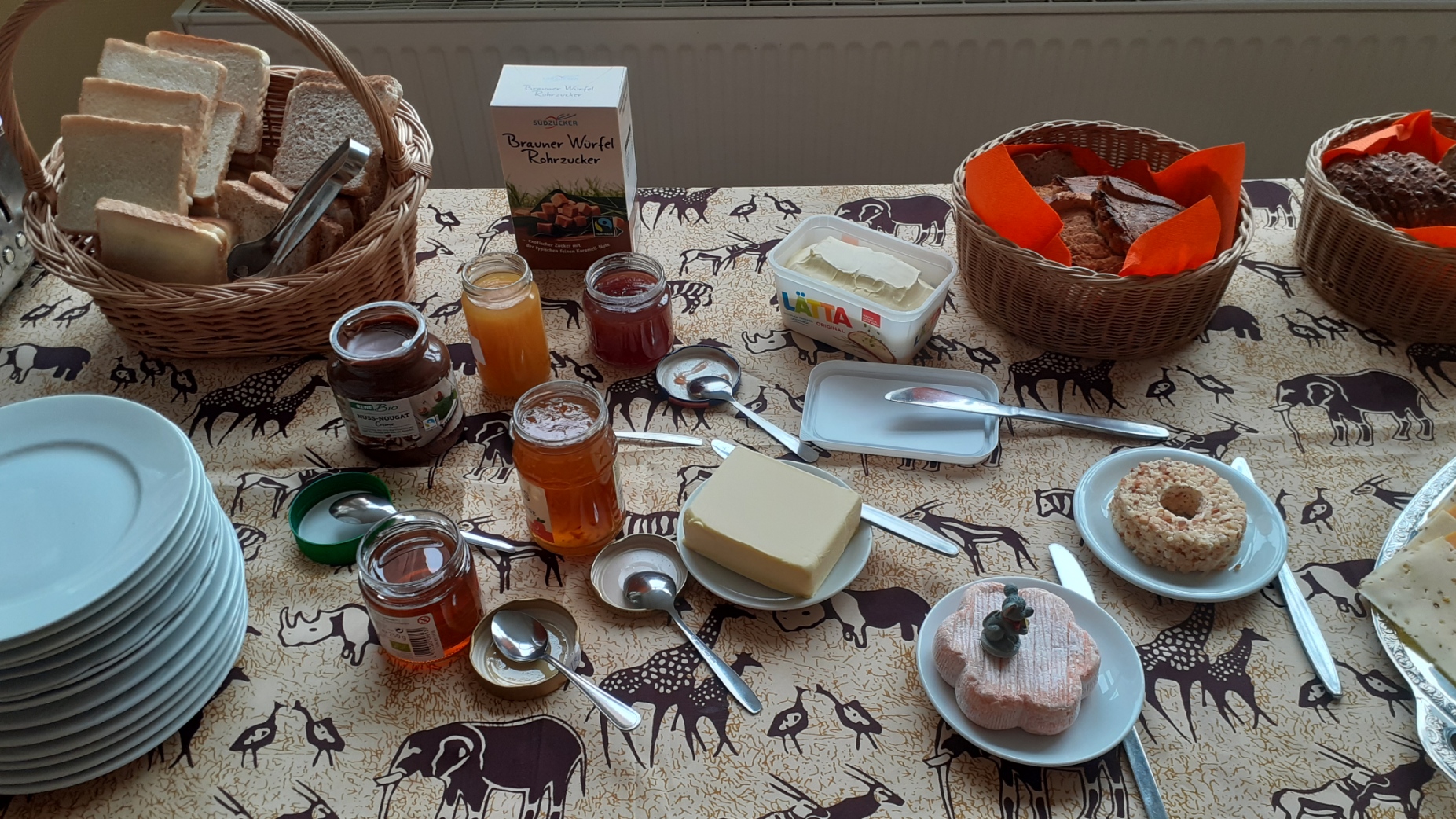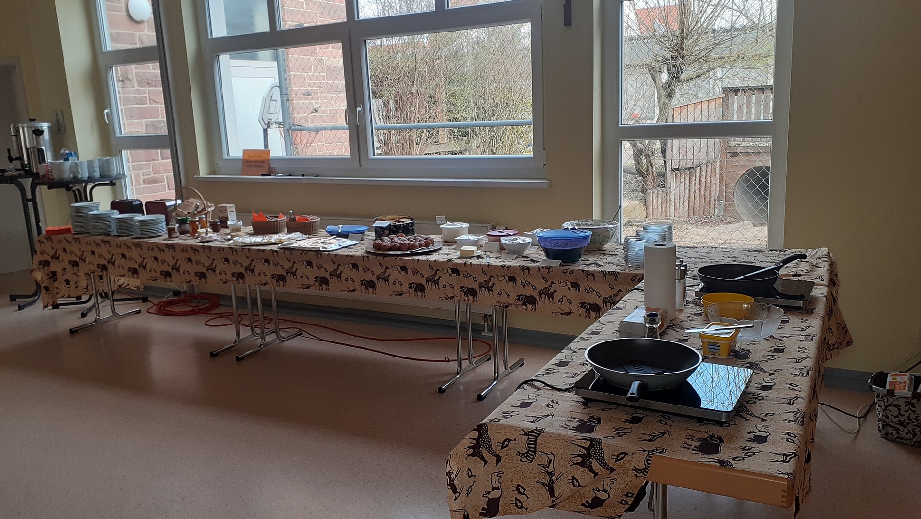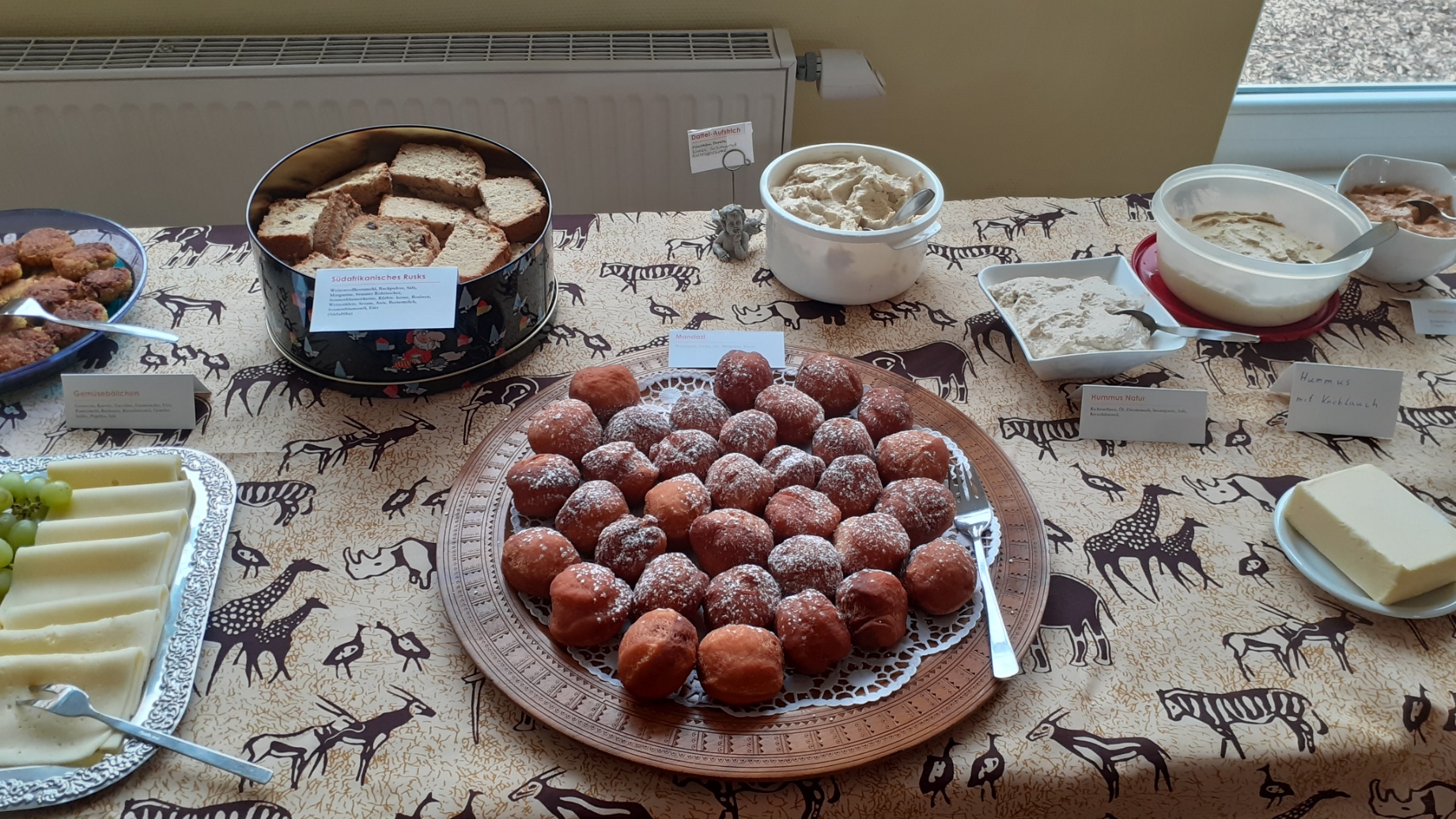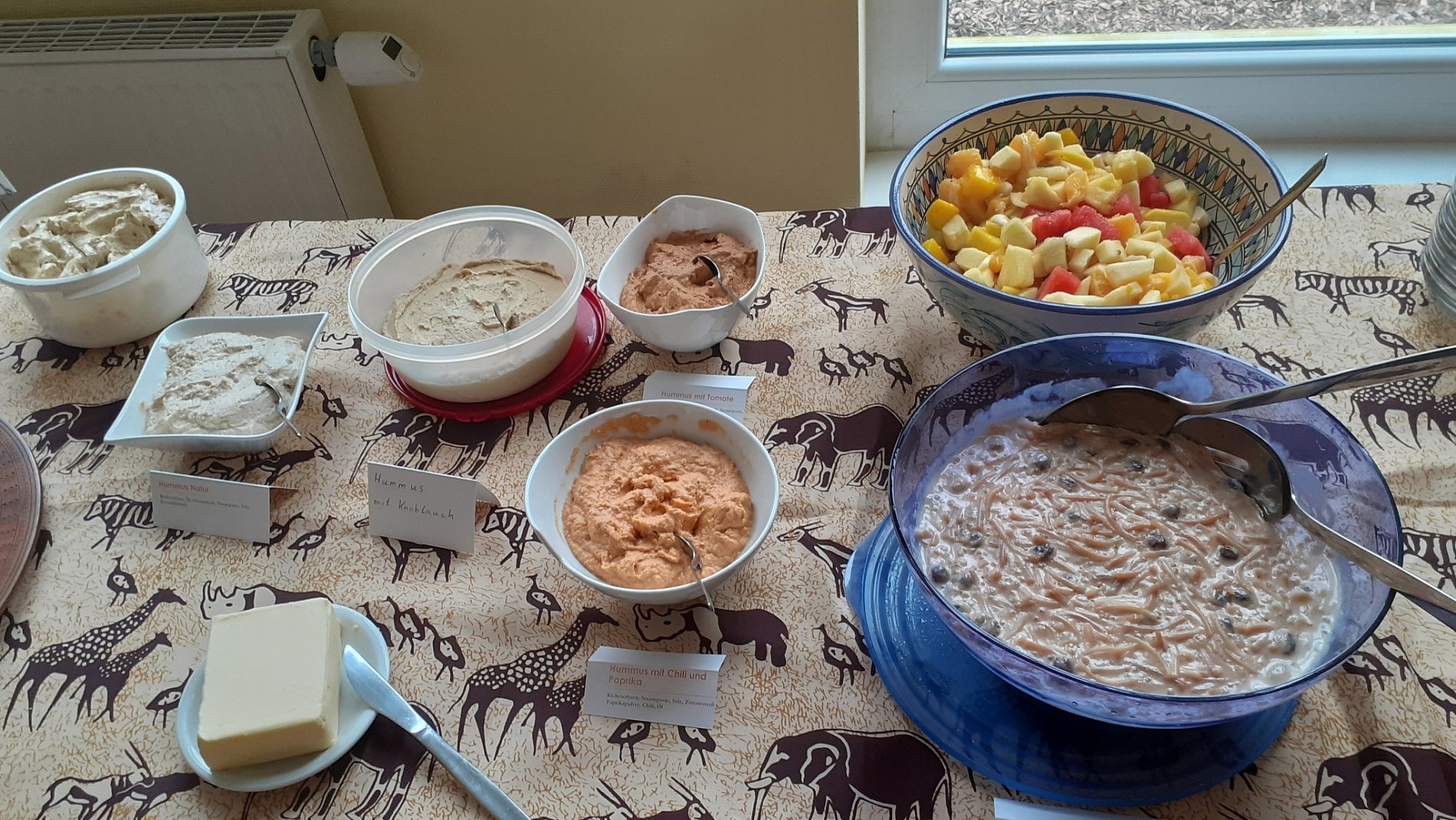 Mit einer großen Vielfalt verwöhnt der Arbeitskreis Partnerschaft Chipulukusu seine Gäste ein weiteres Mal. Das reichhaltige Buffet enthält über verschiedene Hummussorten, Dattelaufstrich, Käse, Marmeladen, Honig, Schokocreme, Käse, Obstsalat, Boeber (eine süße Fastenspeise der Muslime), frischgebackenen Eiern, Kaffee, Tee bis zu Bananen- und Marcuja-Mango-Nektar alles was man zum Frühstück benötigt. Die Resonanz der Gäste war durch die Bank weg positiv. Ein weiterer Schwerpunkt den der Arbeitskreis auf das Frühstück legt, ist der Fairtrade-Gedanke. Seit vielen Jahren arbeitet der Arbeitskreis Eine-Welt des Kirchortes St. Gallus mit uns zusammen. Er verkauft während des Frühstücks faire gehandelte Waren. Außerdem ist die Kolpingfamilie Flörsheim im Rahmen der Fairtraide-Stadt Partner der Stadt Flörsheim. Der Erlös des Frühstücks finanziert weitere Bücher für die St. Charles-Lwanga-Schule sodass wir dem Ziel für jede/n Schüler*in in jedem Schulfach ein eigenes Buch zur Verfügung stellen zu können näher kommen.